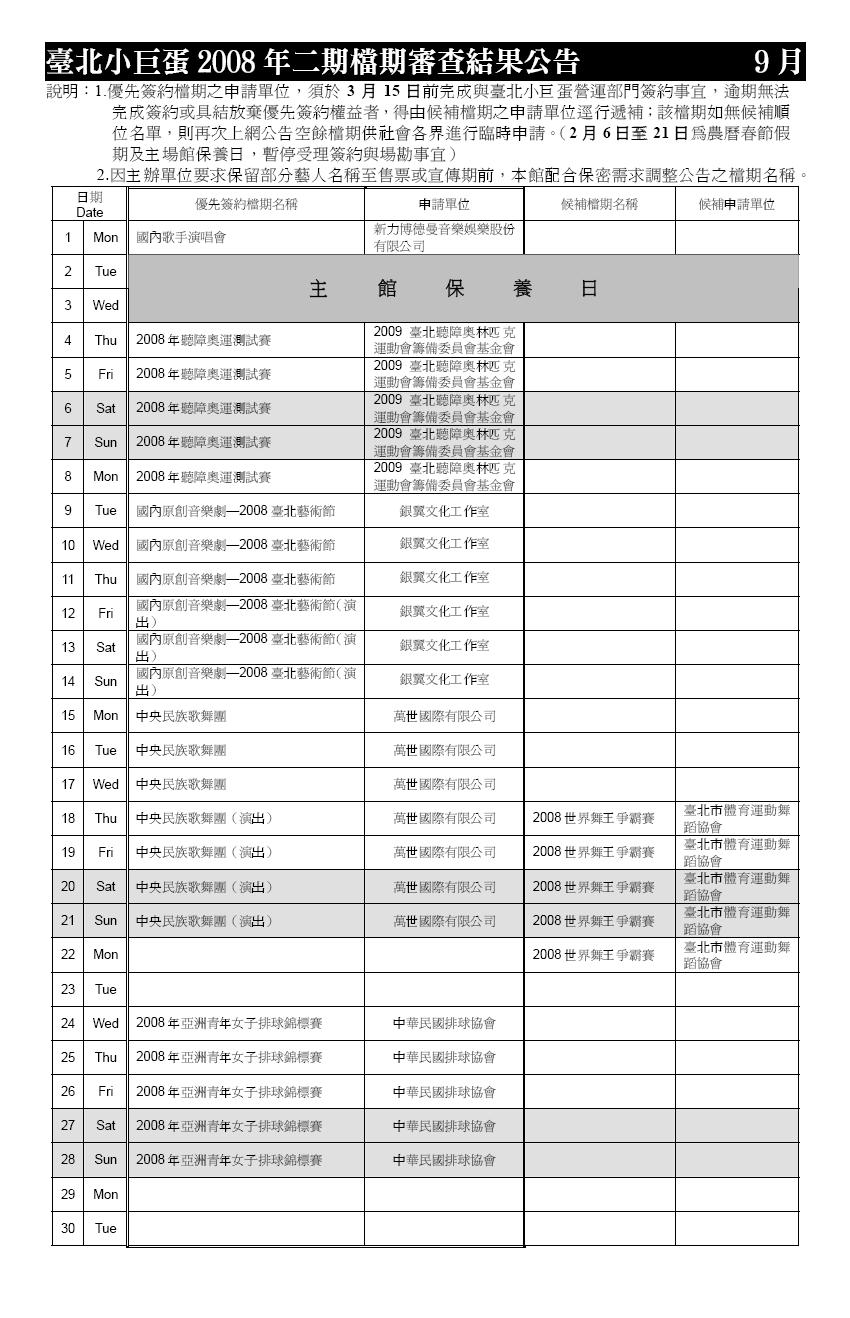 台北小巨蛋 下半年檔期預定表 完整PDF檔 (看九月的部分)