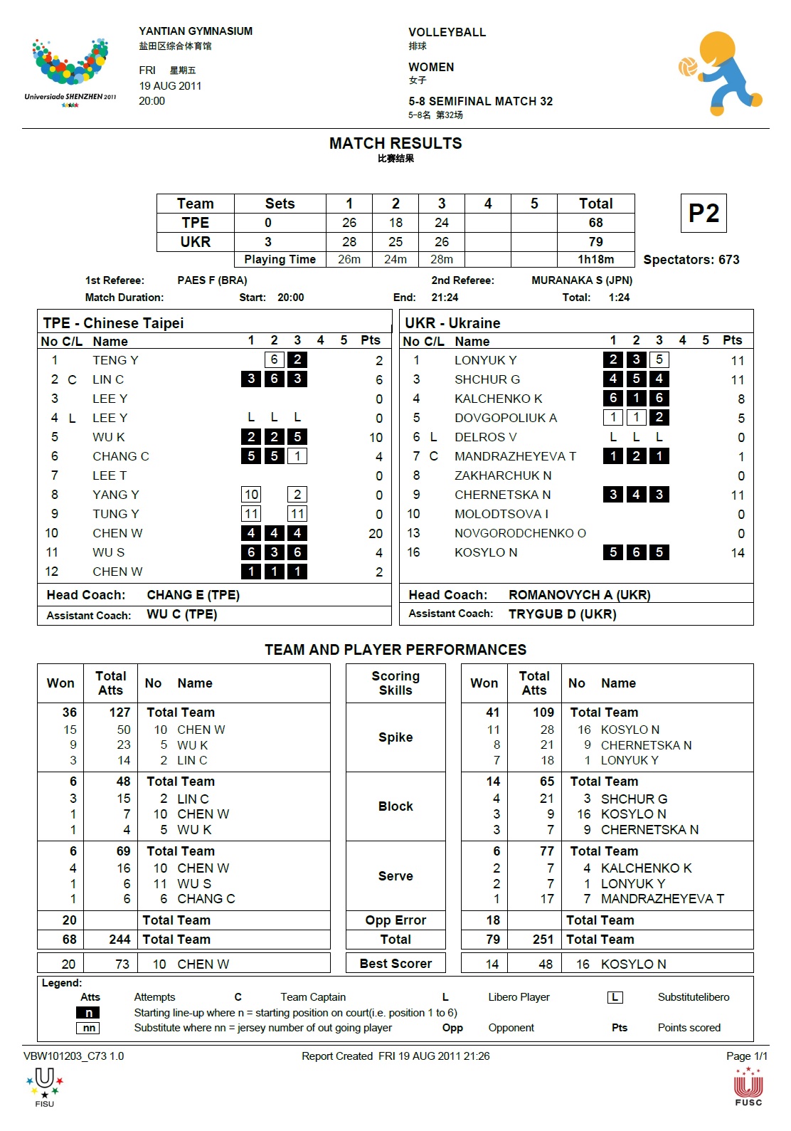 中華女排昨(19)日晚間20:00與烏克蘭進行5-8排名賽,歷時1小時18分,儘管陳菀婷攻下了全場最高20分,可惜仍是以直落三(26-28,18-25,24-26)吞敗,接下來只能於今晚18:00迎戰泰國爭取第七名!