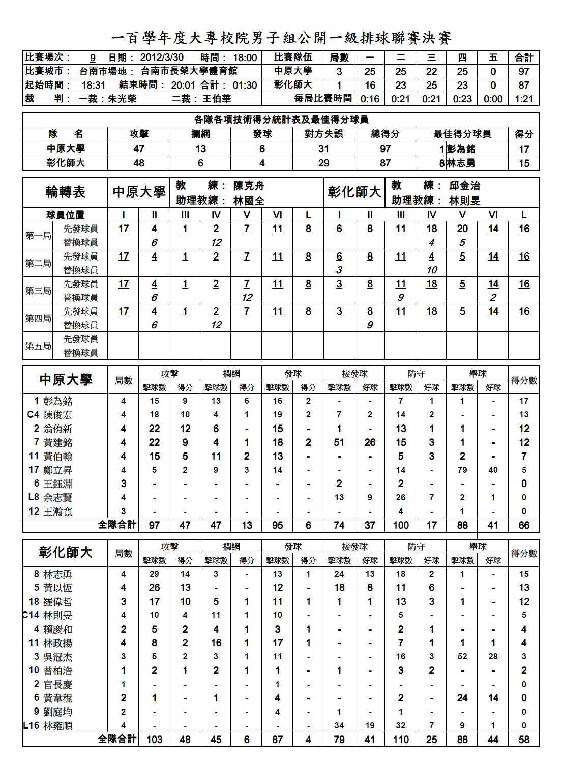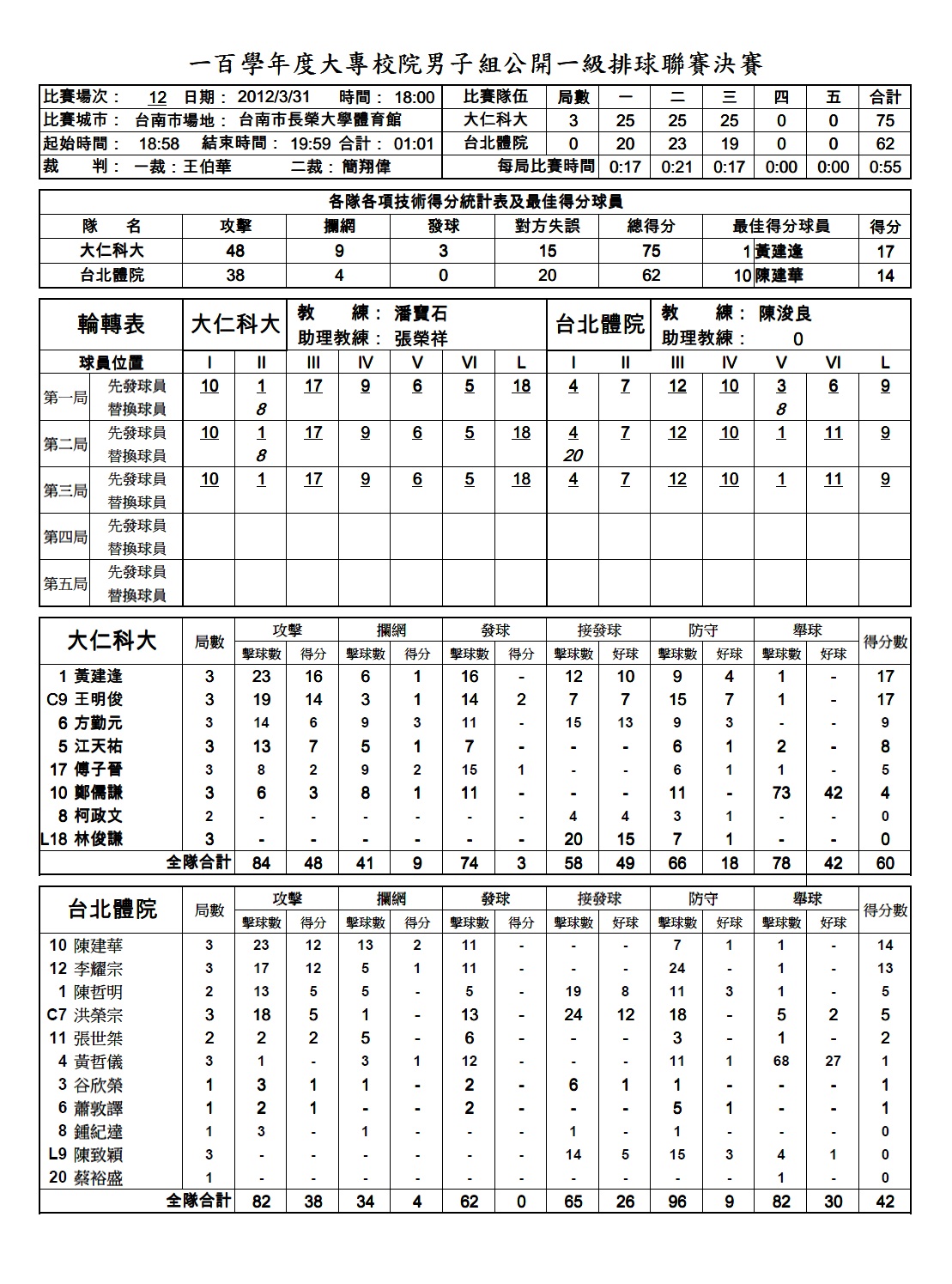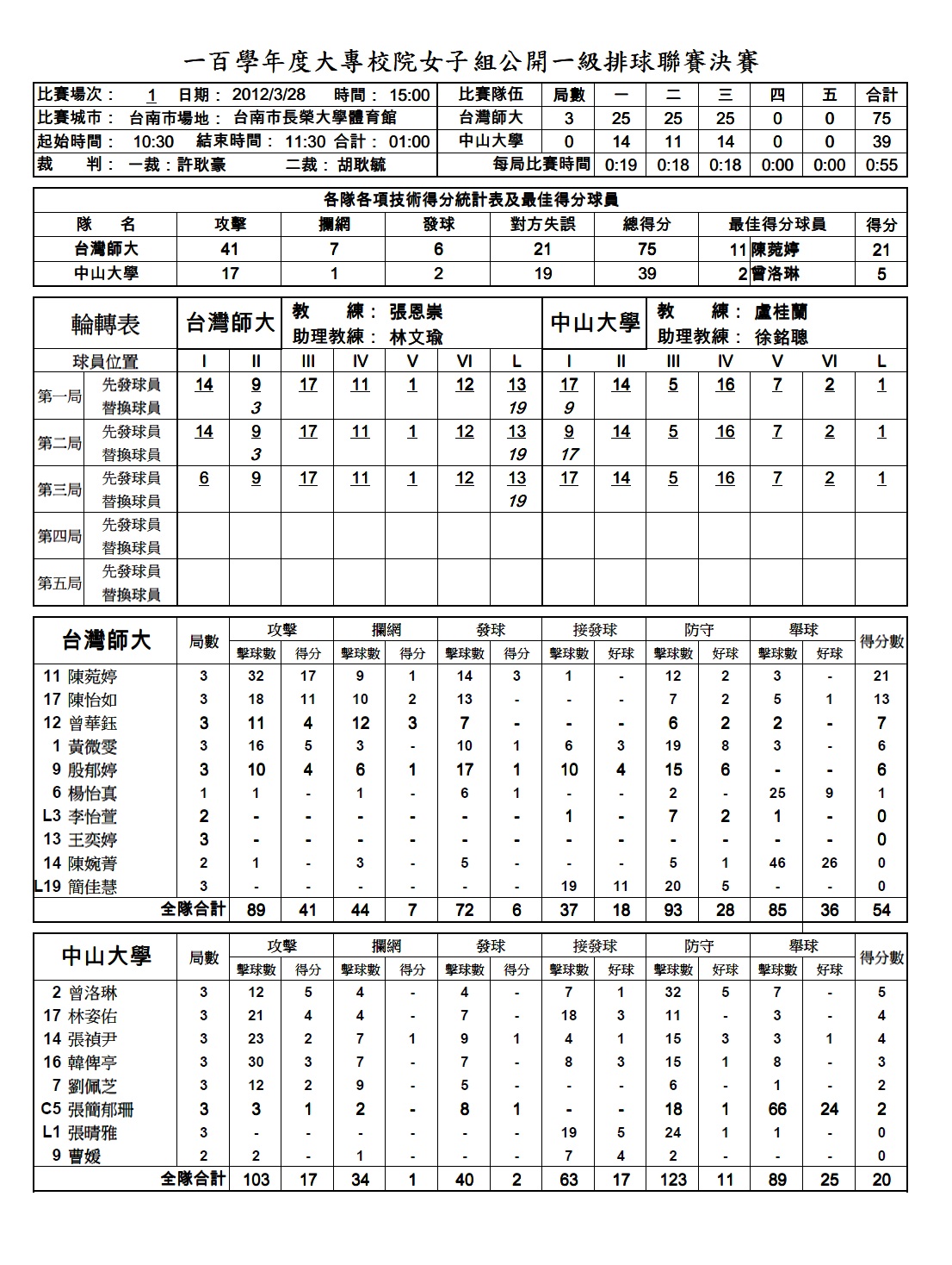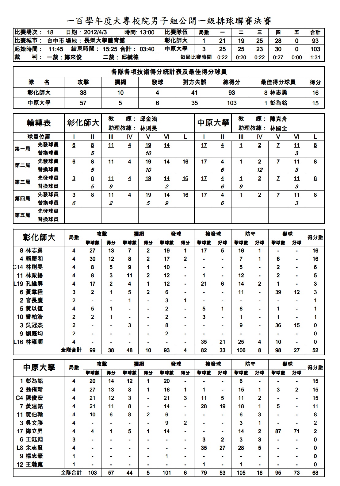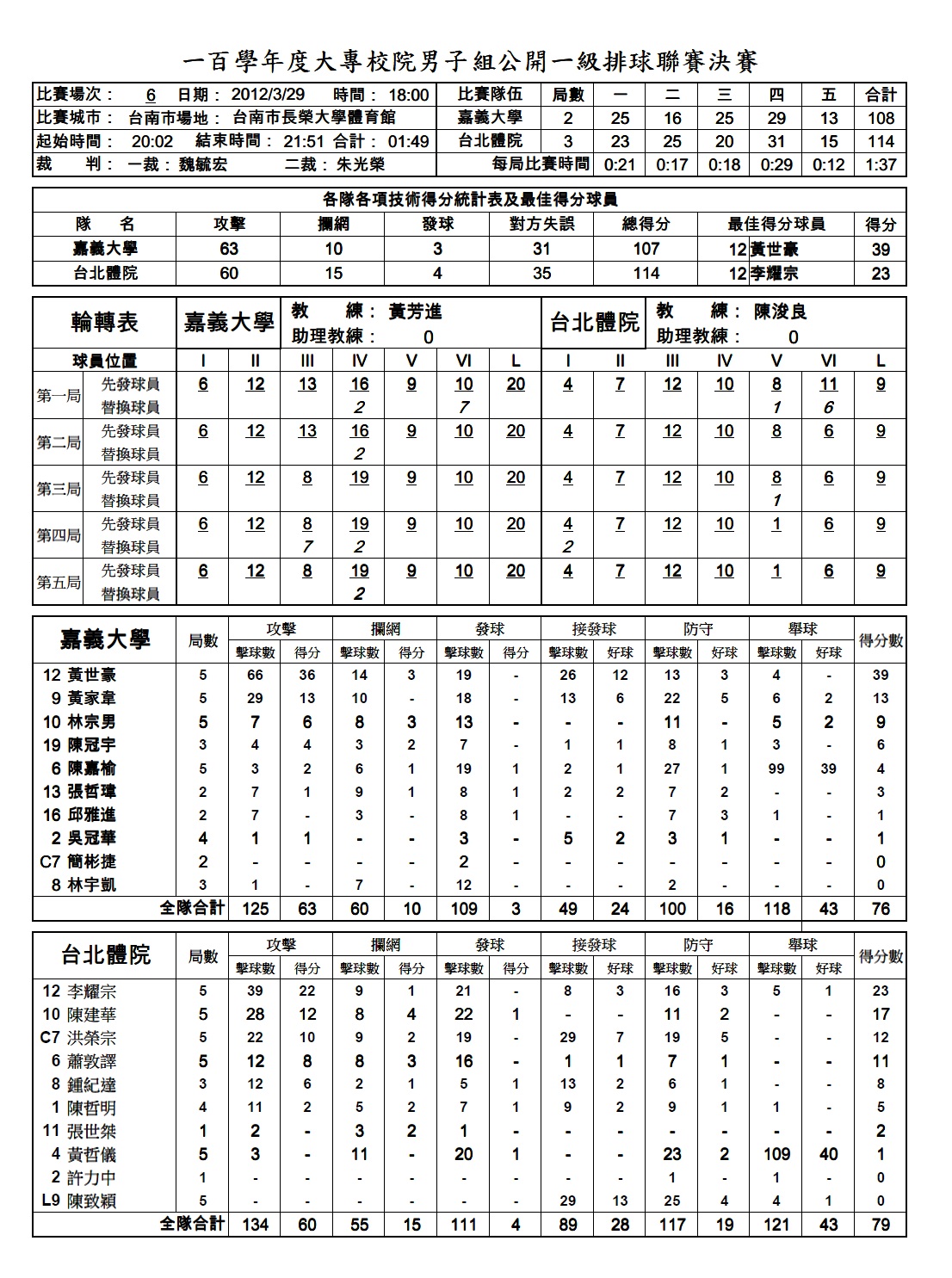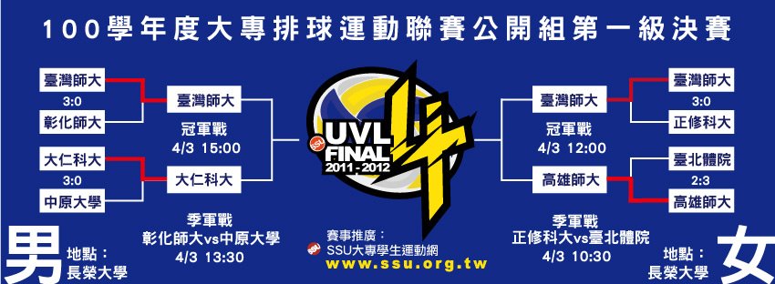 100學年度UVL大專排球聯賽 公開一級六強複決賽 每日比賽結果 |