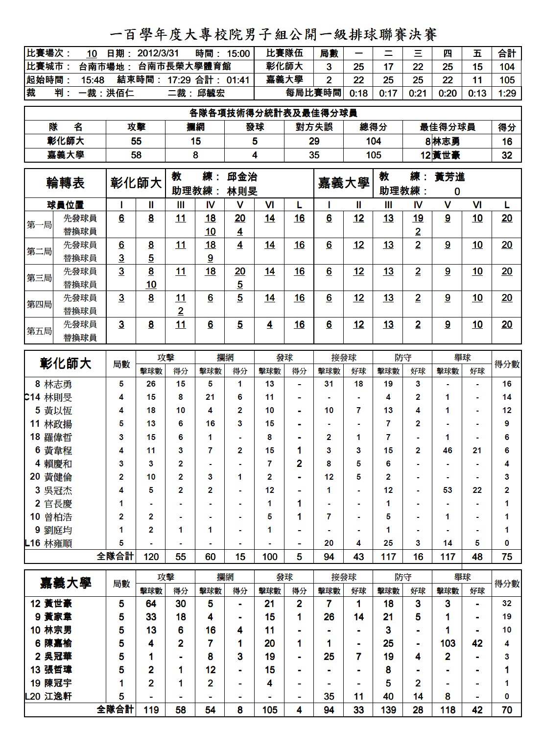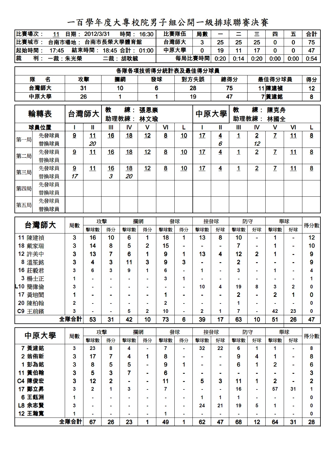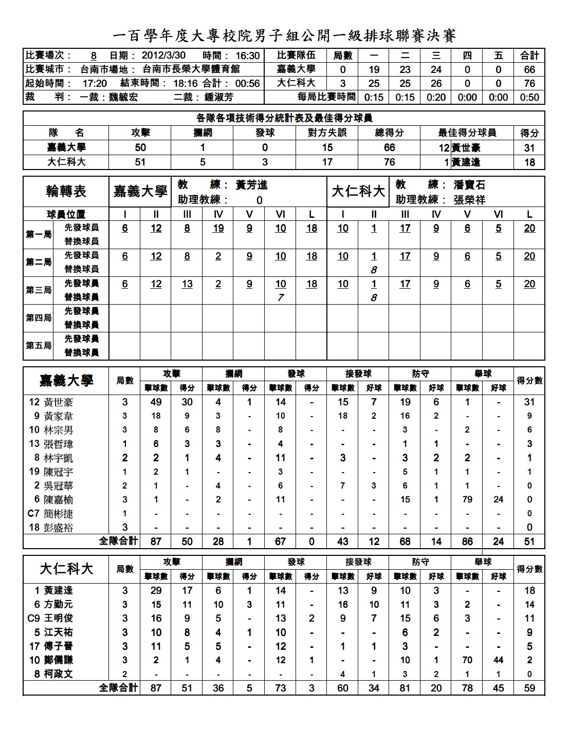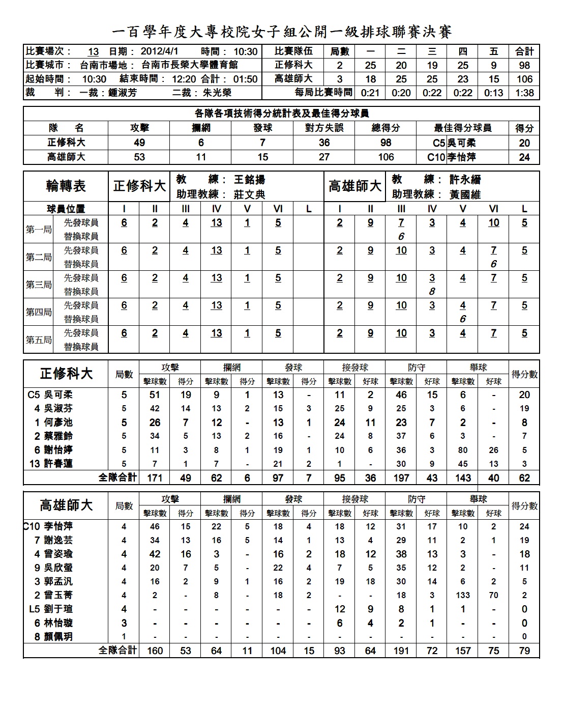 100學年度UVL大專排球聯賽 公開一級六強複決賽 每日比賽結果 |