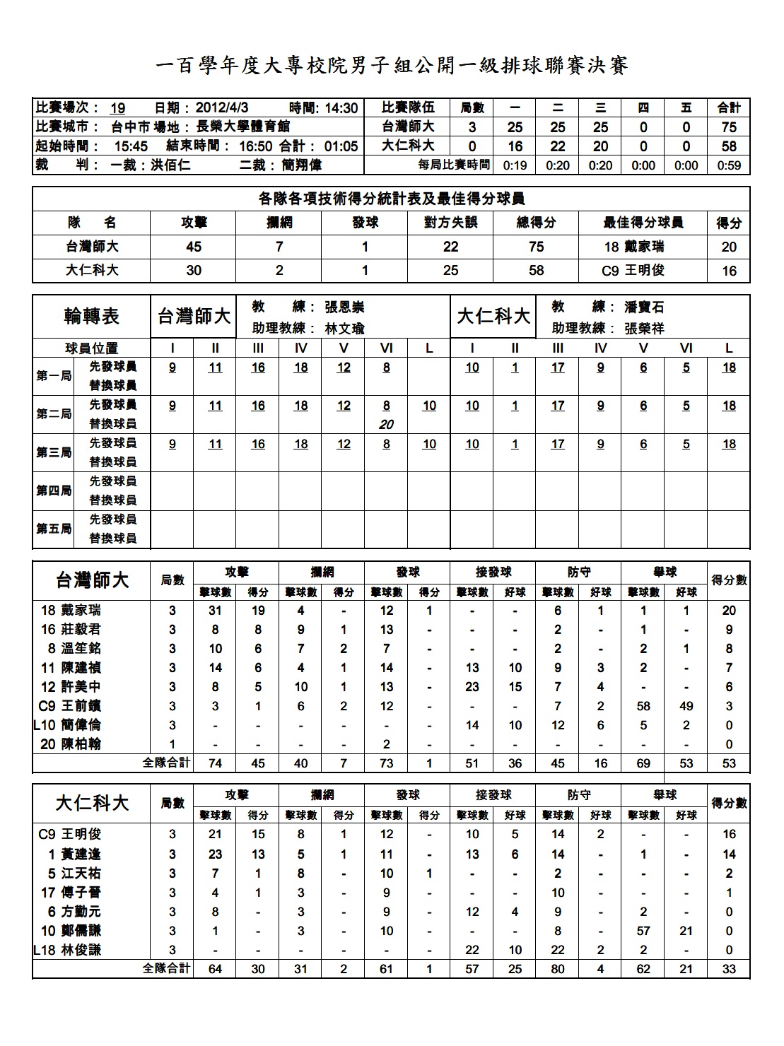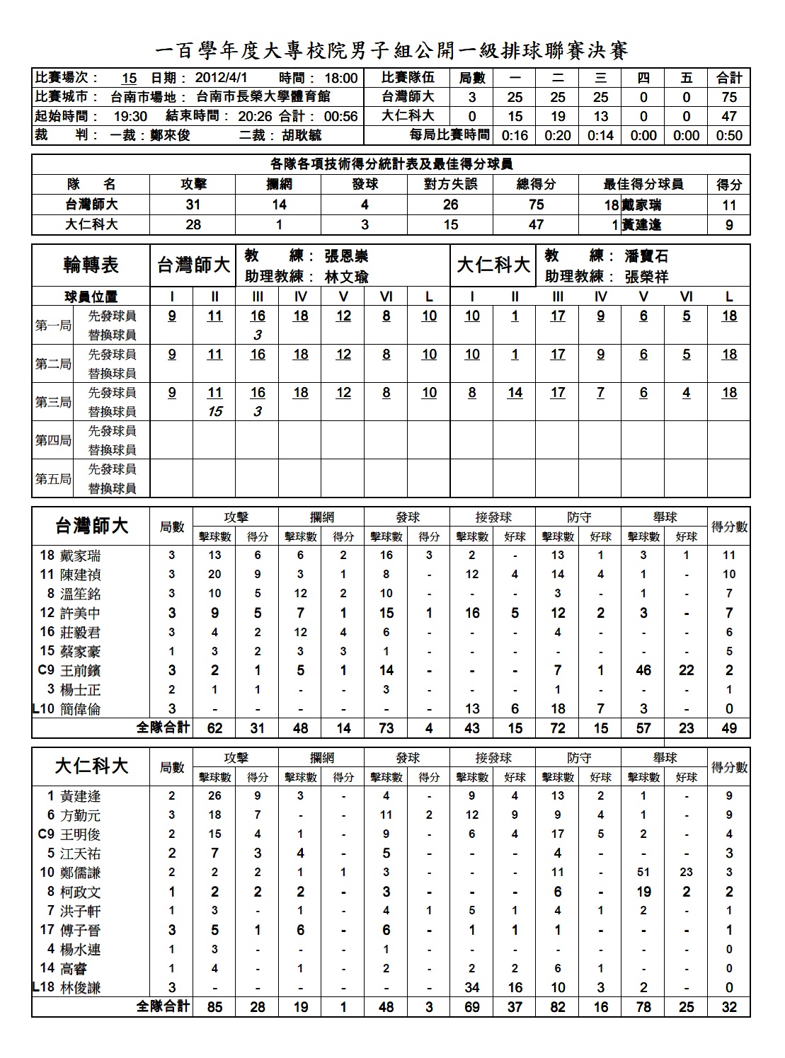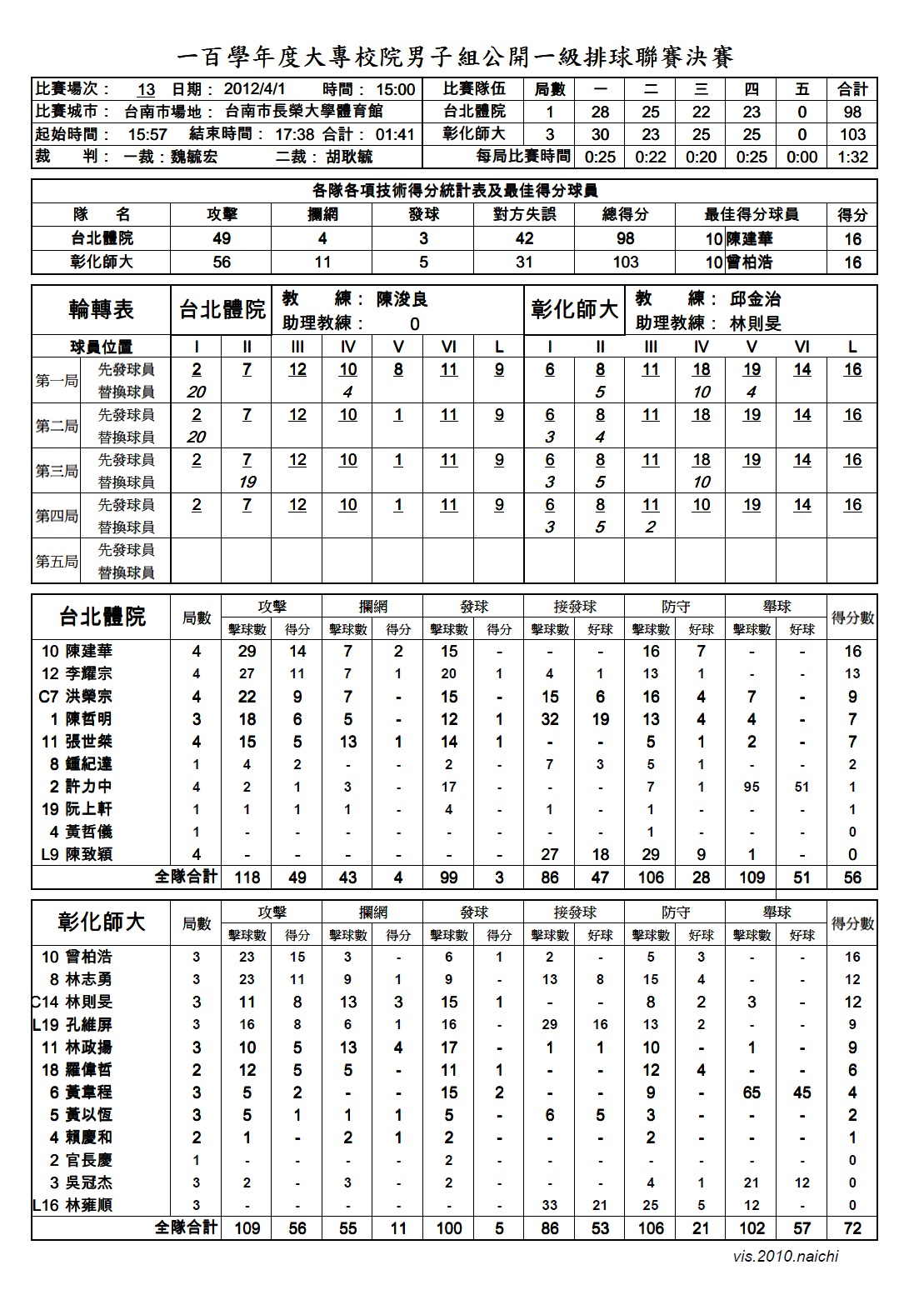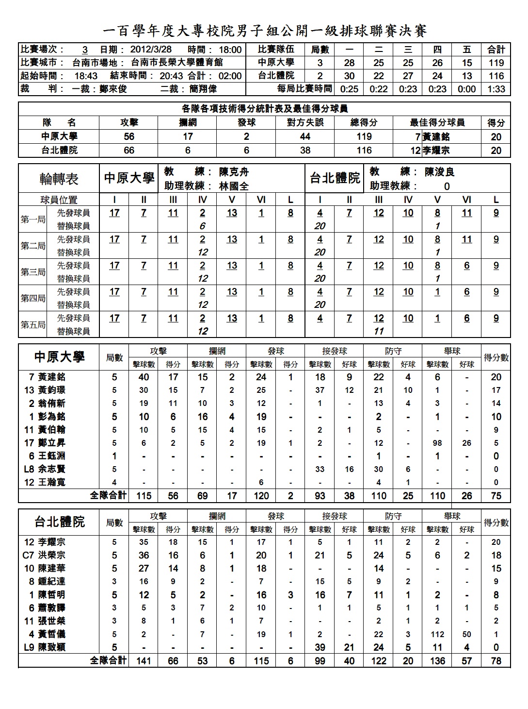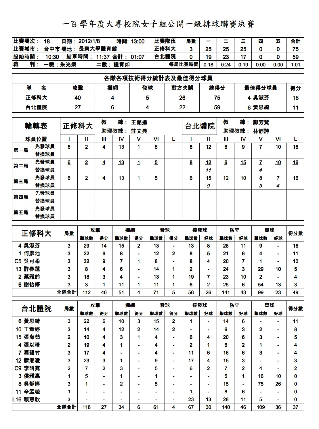 100學年度UVL大專排球聯賽 公開一級六強複決賽 每日比賽結果 |