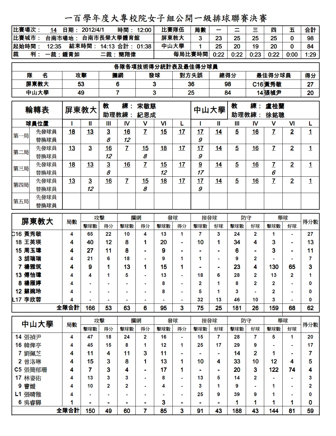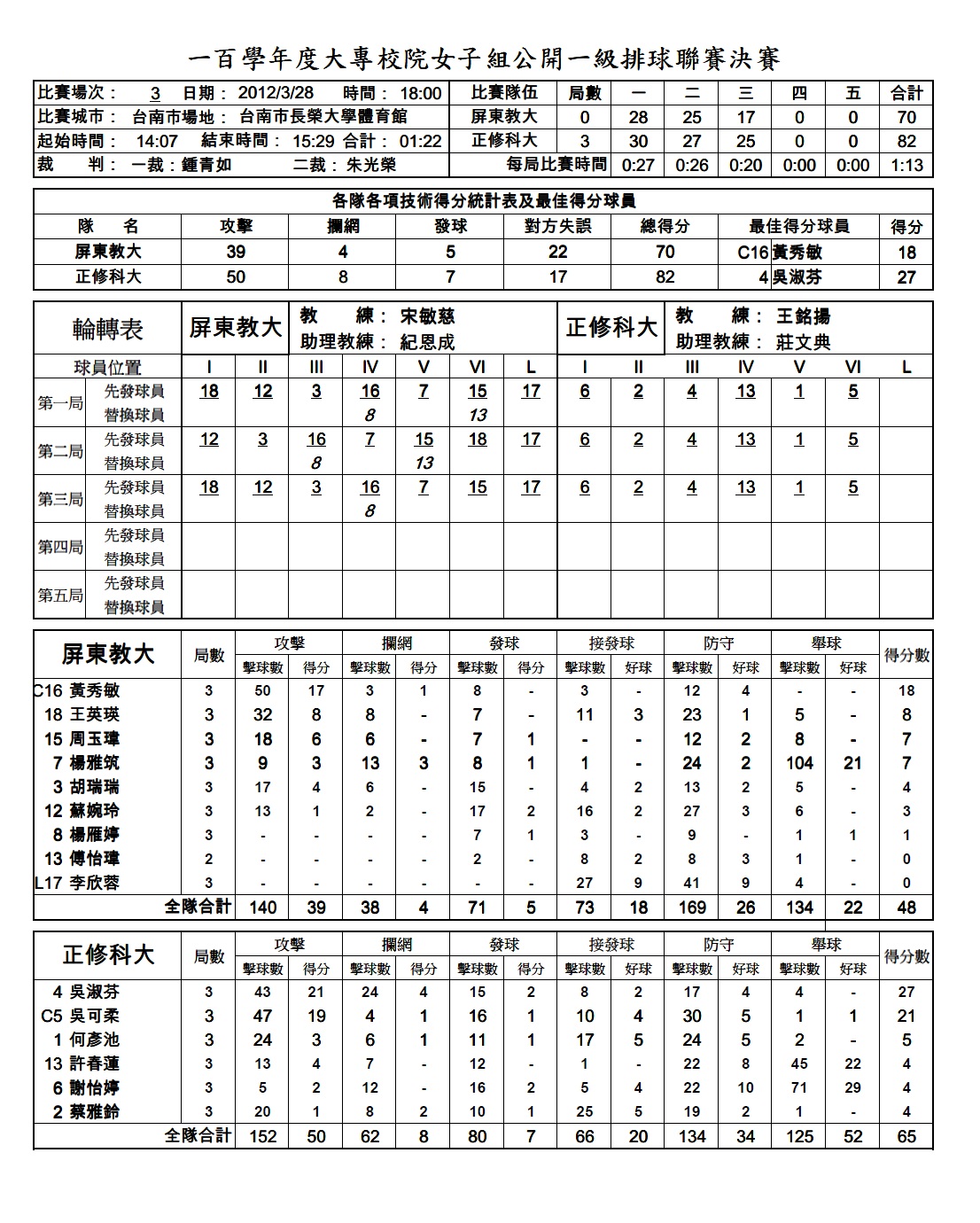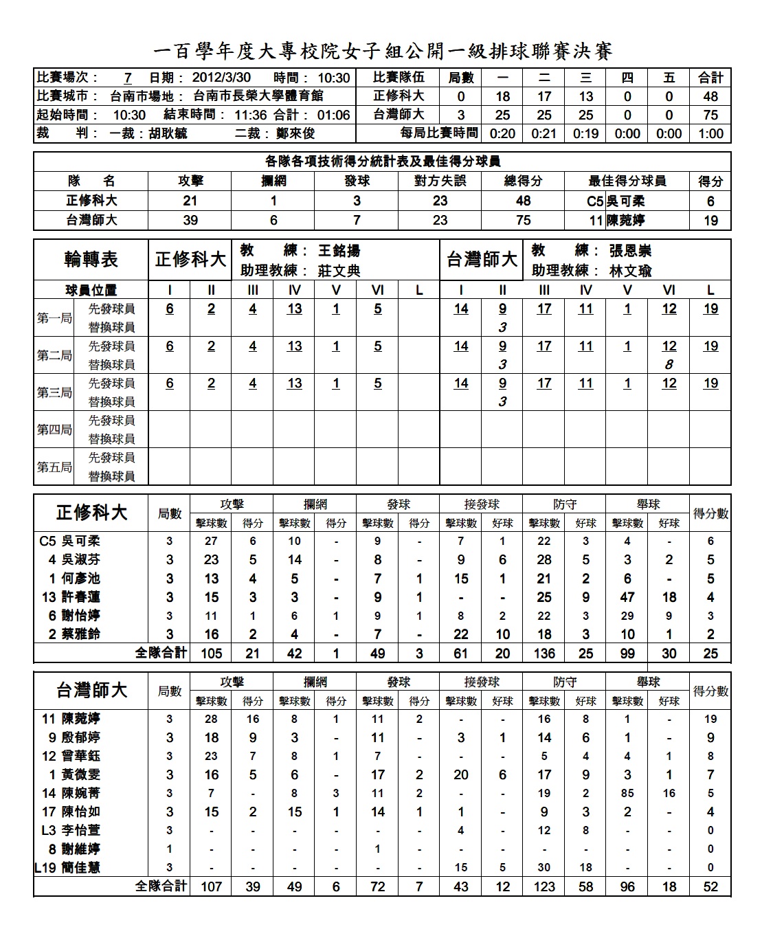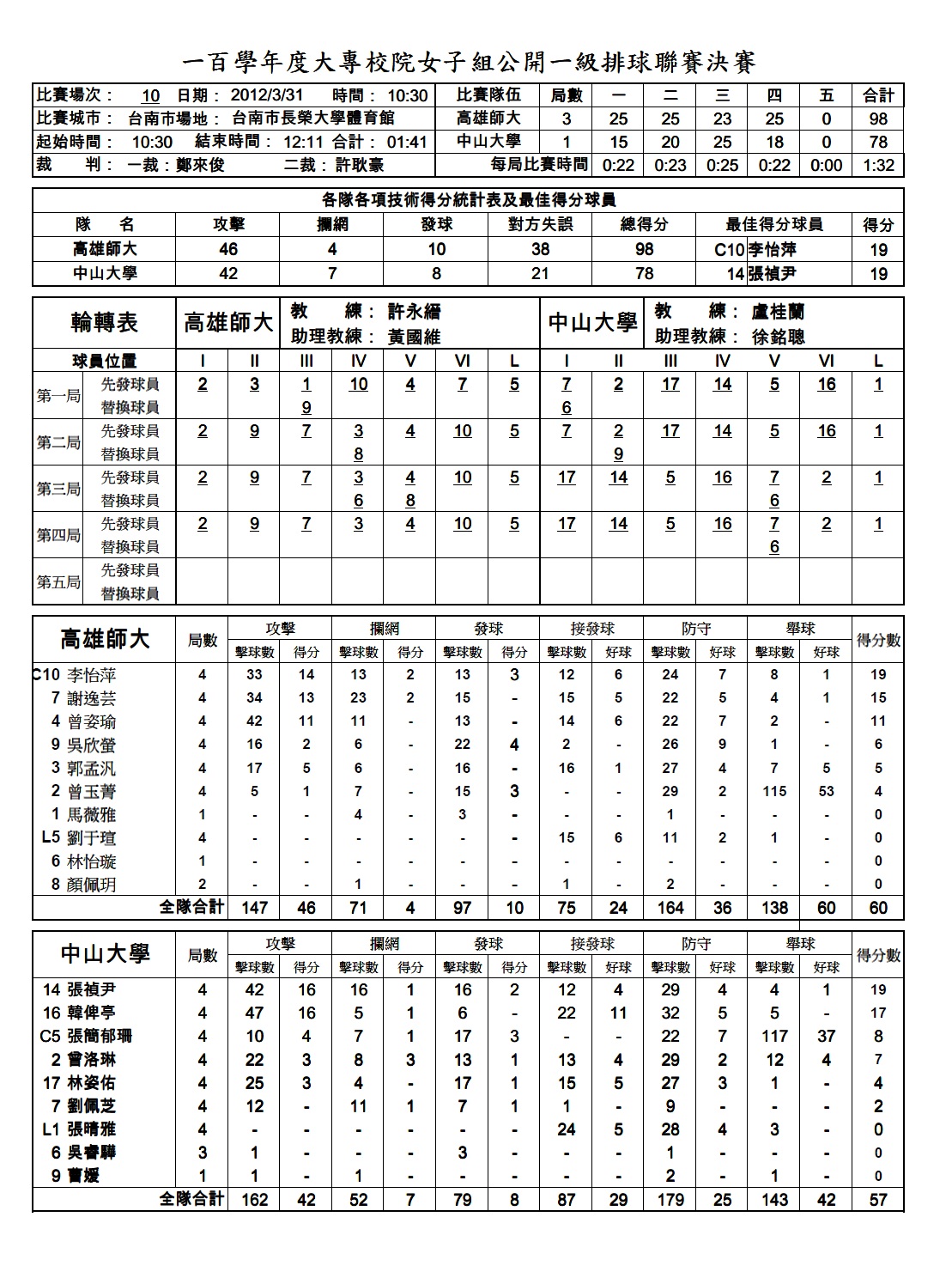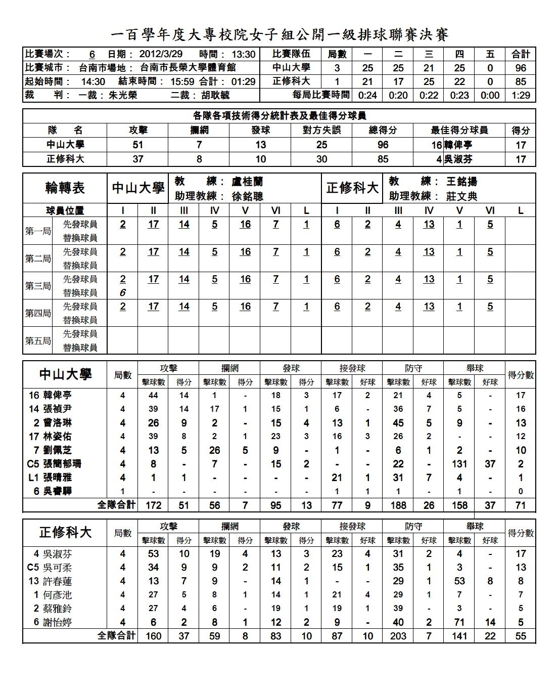 100學年度UVL大專排球聯賽 公開一級六強複決賽 每日比賽結果 |