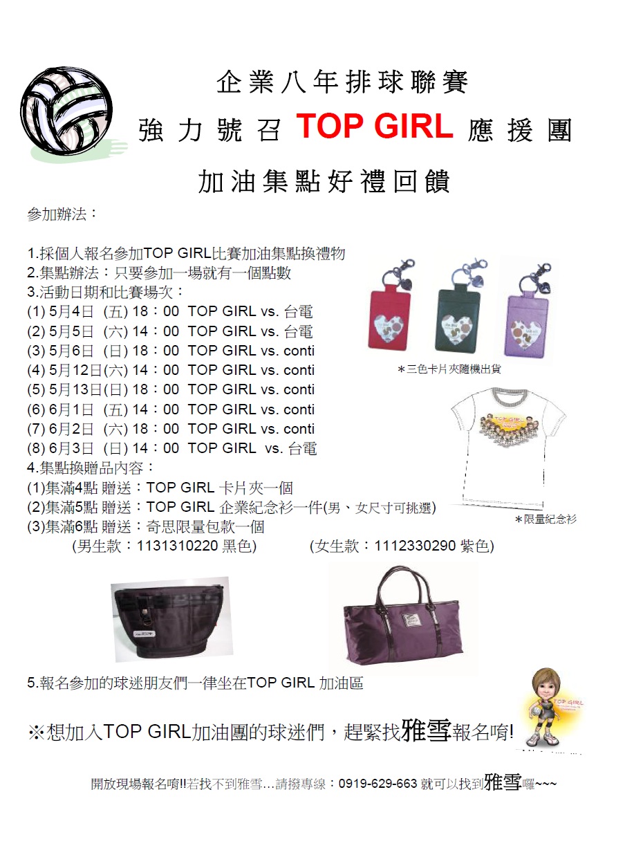 ※想加入TOP GIRL加油團的球迷們,趕緊找雅雪報名唷!