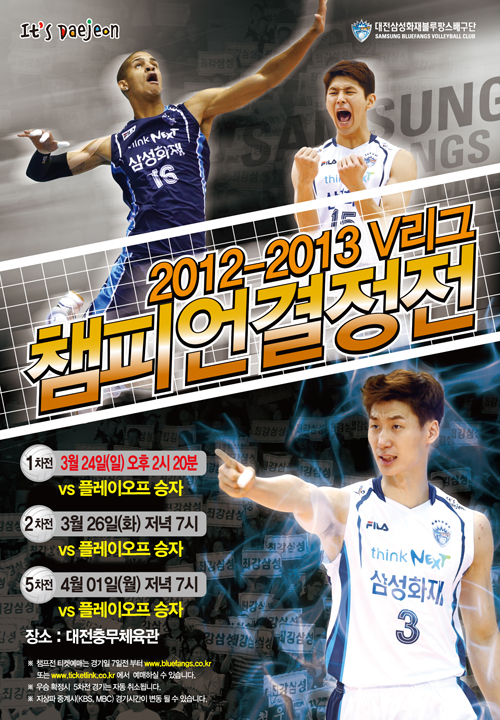 2012-13年韓國職業排球聯賽總冠軍戰將從24日開打,由尋求六連霸的三星火災(Samsung Fire Bluefangs)對上第一輪晉級的大韓航空(Korean Air Jumbos),這已經是連續三年上演同樣戲碼,採五戰三勝制,精采賽事網路場場LIVE直播。