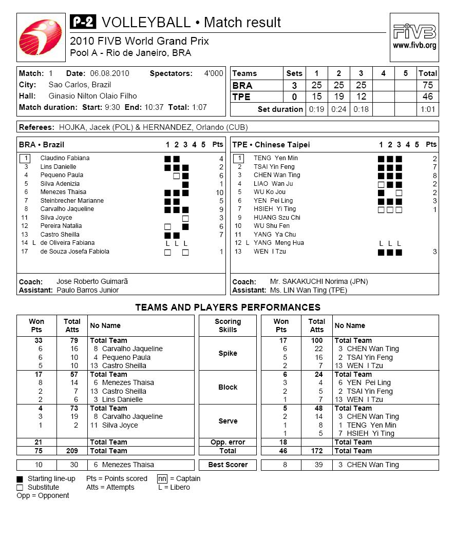 個人得分部份,本場比賽中華隊以陳莞婷拿下8分為全隊最高,而第二度參加大獎賽的蔡盈鳳以7分居次,另外巴西隊高達17次直接攔網得分也是我方敗陣的主因之一。