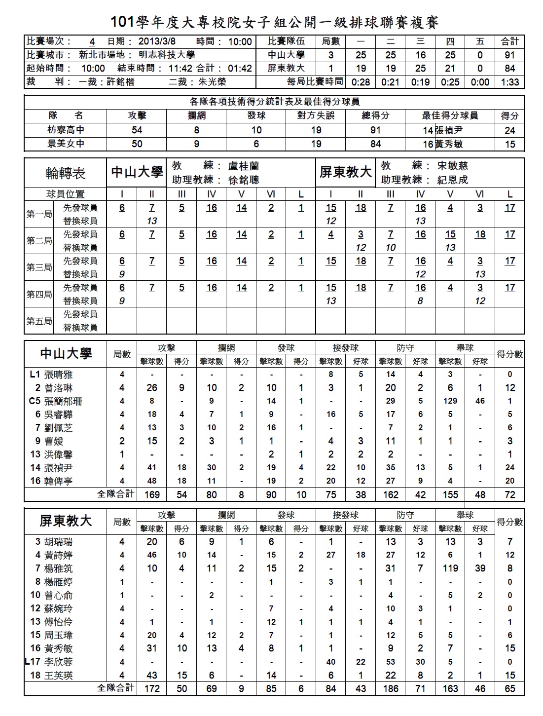 台北體院 4勝1敗 中山大學 4勝1敗