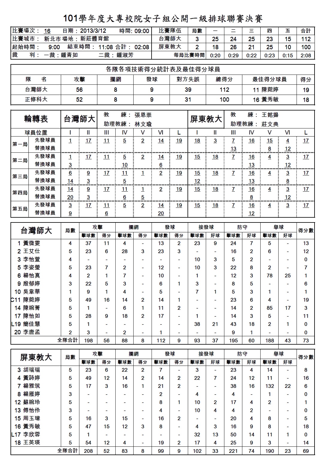 中原大學 2勝3敗 屏東教大 2勝3敗